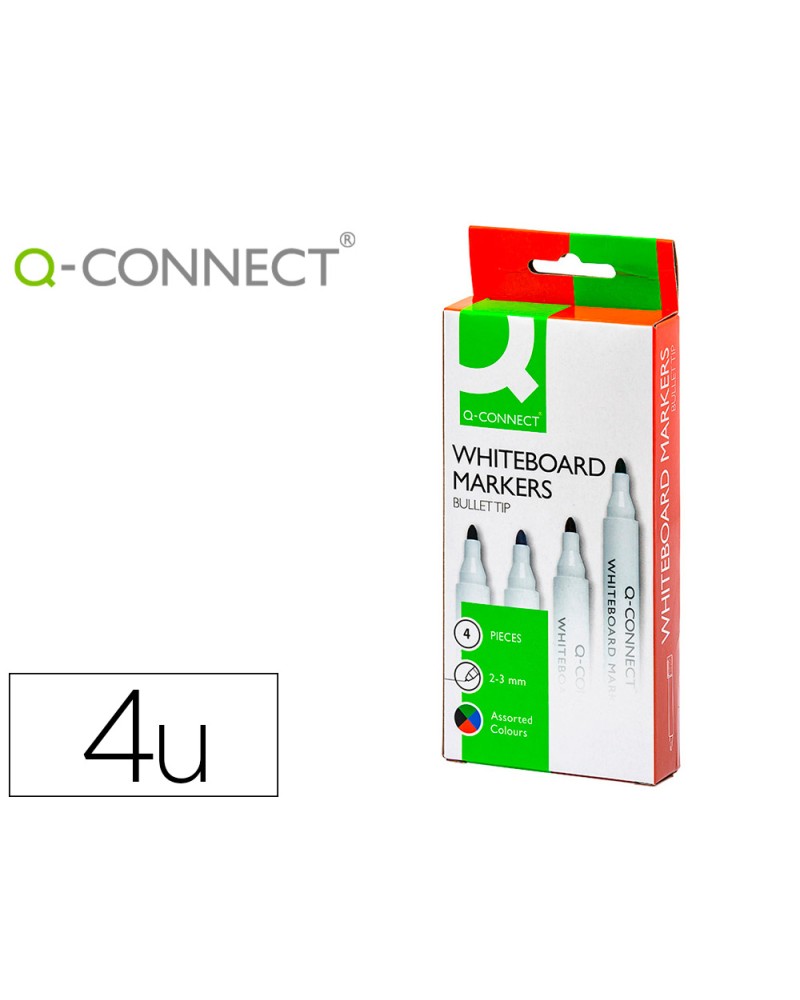 MARQUEUR Q-CONNECT TABLEAU BLANC POINTE OGIVE TRACÉ 2/3MM CORPS PLASTIQUE ENCRE BASE ALCOOL POCHETTE 4 UNIT ASSORT